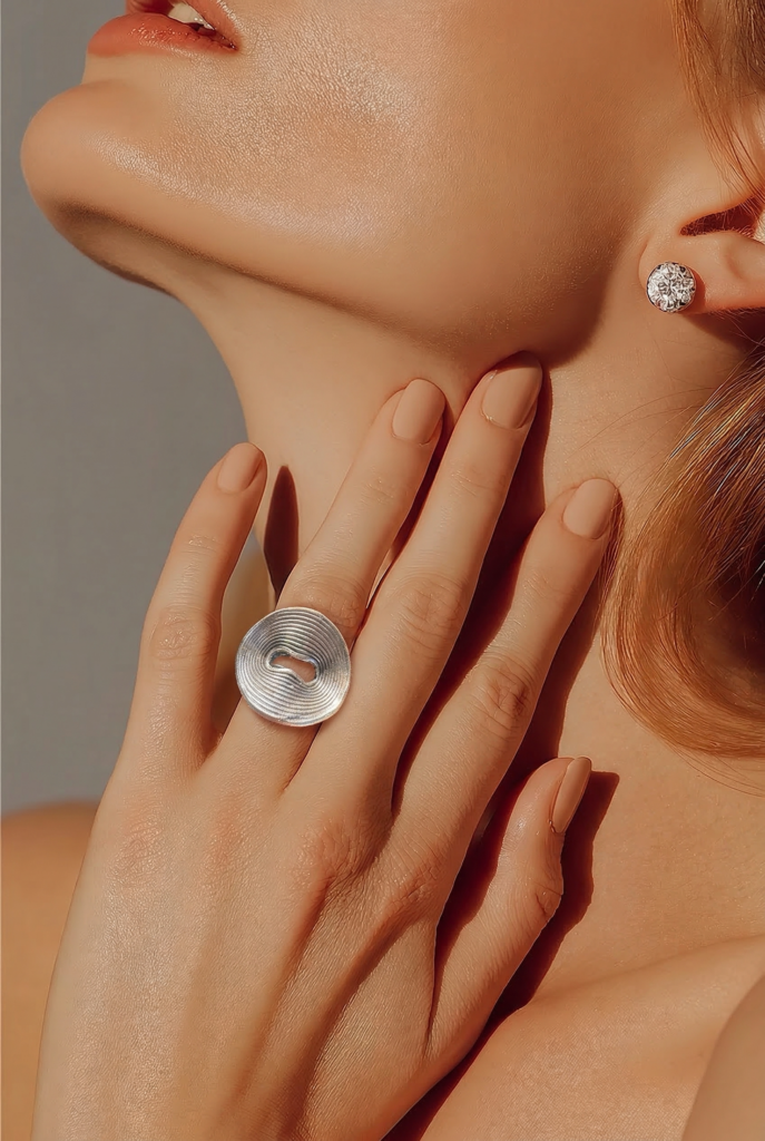 Elegante anillo elaborado en ZAMAC, una resistente aleación de zinc, magnesio, aluminio y cobre, y posteriormente bañado en plata para lograr un acabado brillante y sofisticado.