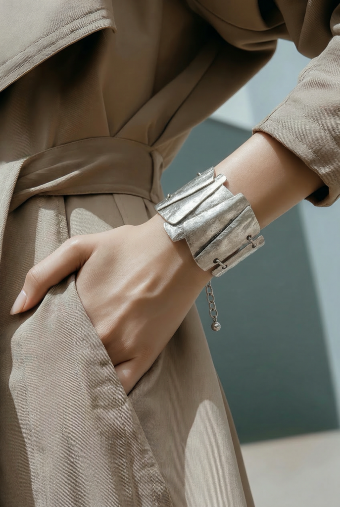 Elegantepulsera elaborada en ZAMAC, una resistente aleación de zinc, magnesio, aluminio y cobre, y posteriormente bañado en plata para lograr un acabado brillante y sofisticado.