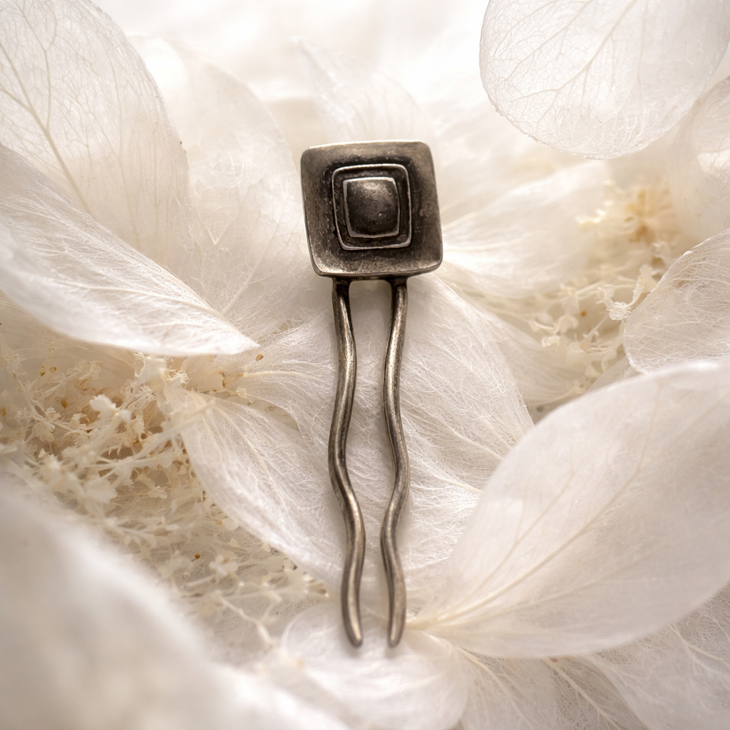 Elegante pincho para el pelo elaborado en ZAMAC, una resistente aleación de zinc, magnesio, aluminio y cobre, y posteriormente bañado en plata para lograr un acabado brillante y sofisticado.