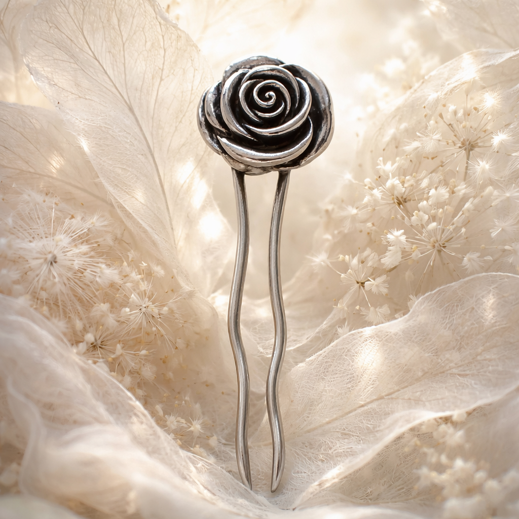 Elegante pincho para el pelo elaborado en ZAMAC, una resistente aleación de zinc, magnesio, aluminio y cobre, y posteriormente bañado en plata para lograr un acabado brillante y sofisticado.