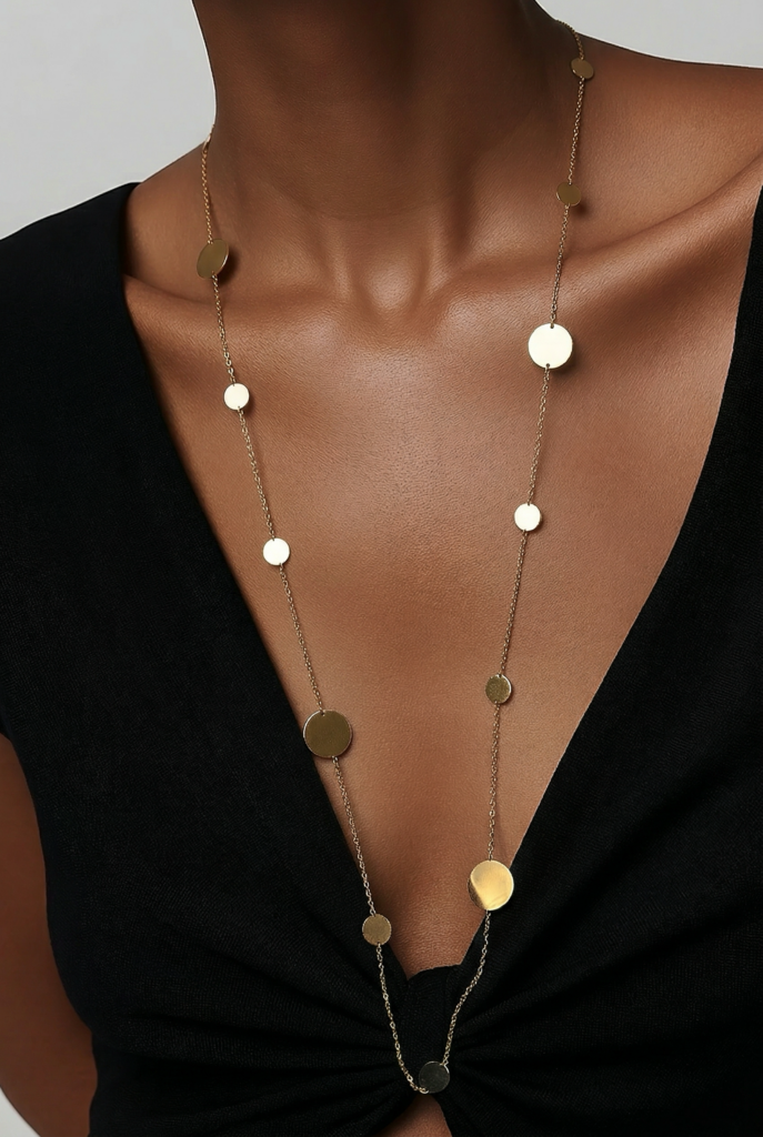 Este collar de diseño elegante destaca por su delicado colgante de acero, una pieza que aporta distinción y sofisticación a cualquier conjunto.